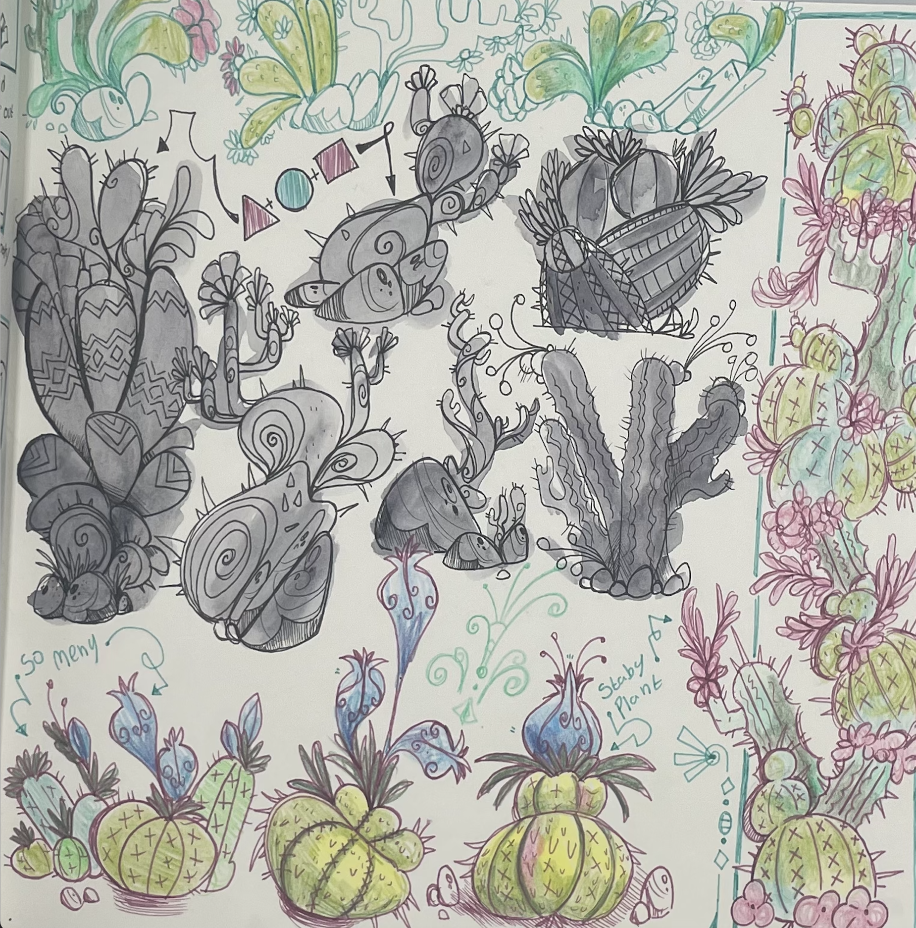 Drawing on the significance of the Malta clay figures and their connection to motherhood, I incorporated elements such as stretchmarks, inspired by the cracks found in clay, across the goddess's body. Embracing the theme of naturalism, I took cues from Gaia, with trees and plants, particularly local vegetation like cactuses and prickly pears, growing from her head to form her hair. The character design features soft, rounded edges and circles, with spirals as a recurring motif, creating a warm and huggable appearance.